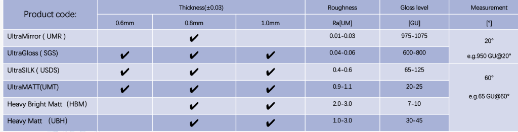 Поставляются ламинационные пластины с разной степенью глянцевости и матовости поверхности, в диапазоне параметра шероховатости (Ra 0,01 -3 мкм), толщиной от 0,6 до 1,0 мм, с размерами - А4, 295х480 мм, и др. Пластины с зеркальной и глянцевой поверхностью подходят для карт предназначенных для персонализации на термосублимационных карточных принтерах. Матовые рекомендуются для изготовления инлеев и карт с инлеями.